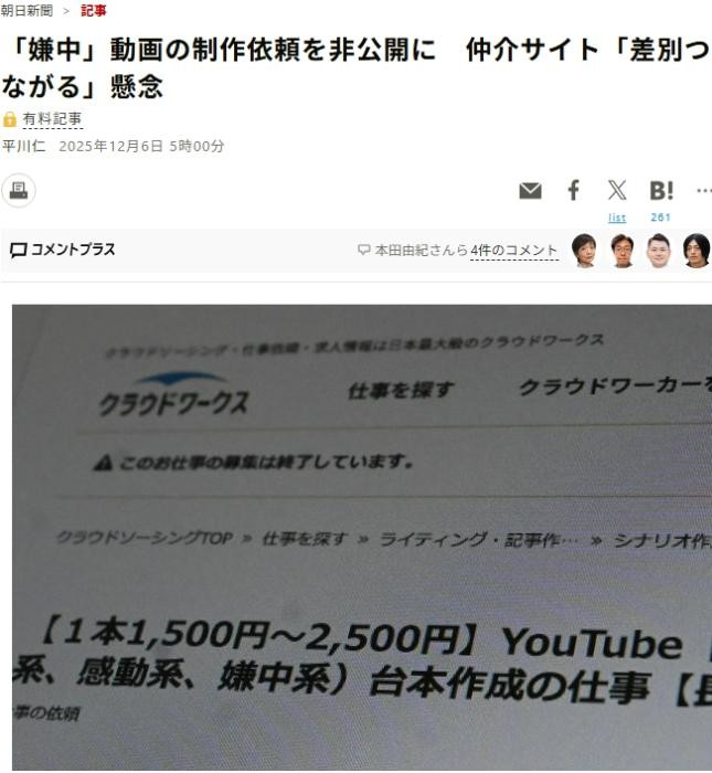 虽然“云工作”尚未公开已下架的相关招聘数量信息,但《朝日新闻》表示,从已被实施下架处理的一招聘者展开调查后发现,2024年11月到2025年11月,其至少发布了14条招聘信息,内容均为制作宣扬“批判中国”“反华”等立场的视频,共有31人达成业务委托合同。